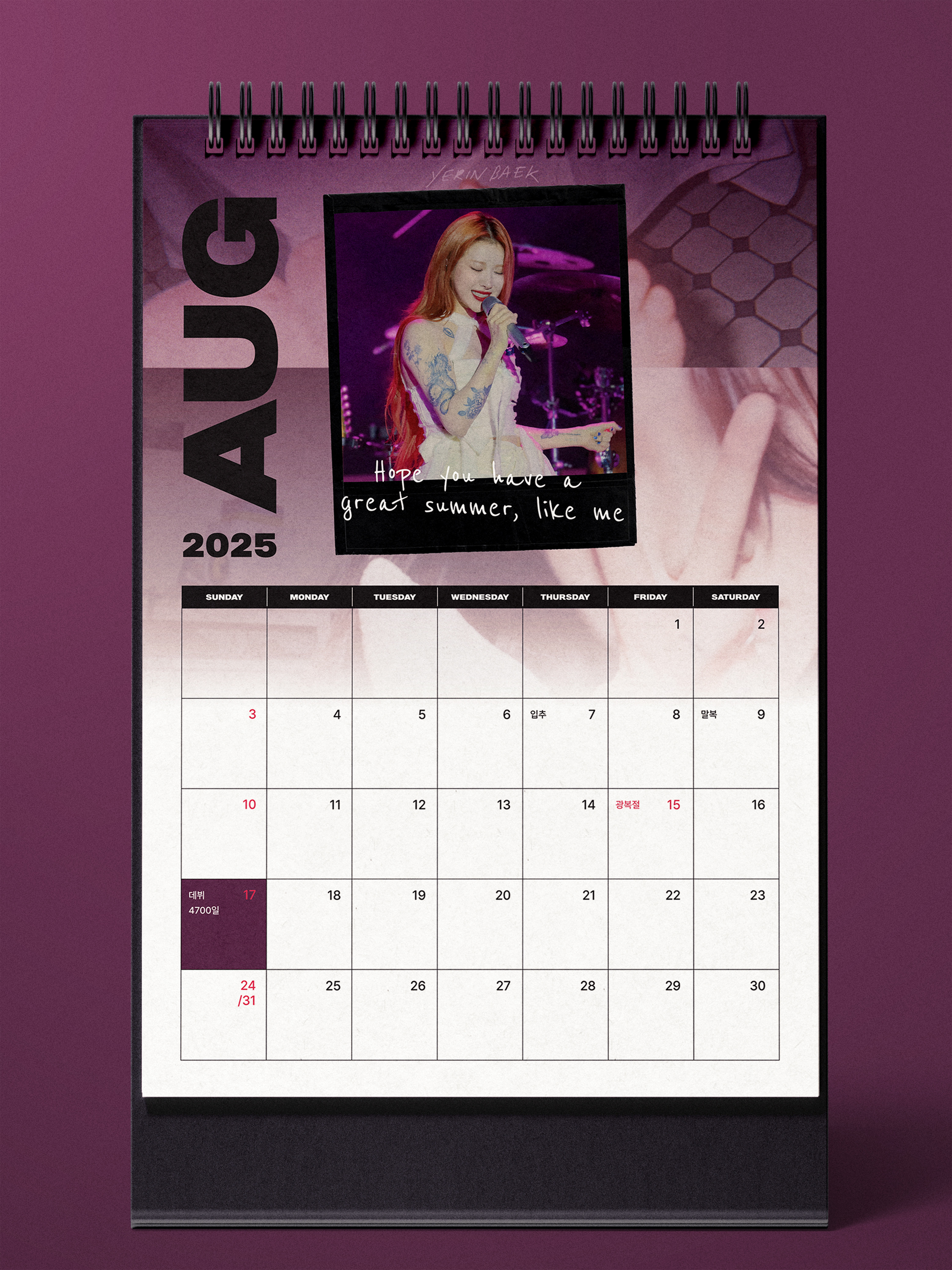 8월 August 2025 YERIN BAEK CALENDAR by 지누